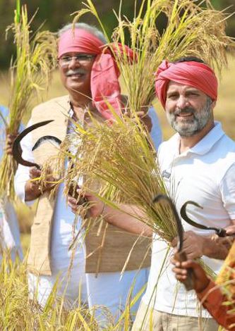 उनके साथ ही सीएम बघेल और डिप्टी सीएम सिंहदेव ने भी हाथों में हंसिया लेकर सिर पर गमछा बांधकर किसानों के साथ मिलकर धान कटाई की।