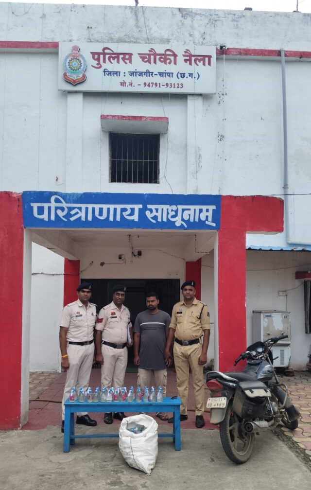 जांजगीर – चाम्पा : पुलिस अधीक्षक जांजगीर – चाम्पा विजय कुमार पाण्डेय (IPS) के निर्देशन में जिला पुलिस जांजगीर द्वारा अवैध शराब पर अंकुश लाने के लिए लगातार कार्यवाही की जा रही है। इसी क्रम में दिनांक 21.06.2025 को अवैध शराब बिक्री करने वालो के विरूद्ध चौकी नैला पुलिस द्वारा मुखबीर सूचना पर रेड कार्यवाही किया गया जिसमें आरोपी पुनेश्वर वर्मा को मोटर सायकल में अवैध रूप से परिवहन करते हुए ग्राम सरखो तरफ पकड़ा गया जिसके कब्जे से 105 पाव देशी प्लेन शराब किमती 8400/ रूपया को बरामद किया जाकर आरोपी के विरूद्ध चौकी नैला में अपराध क्रमांक 568/2025 धारा 34 (2) भादवि. के तहत अपराध पंजीबद्ध किया जाकर विधिवत् गिरफ्तार कर न्यायिक रिमाण्ड पर भेजा गया है।