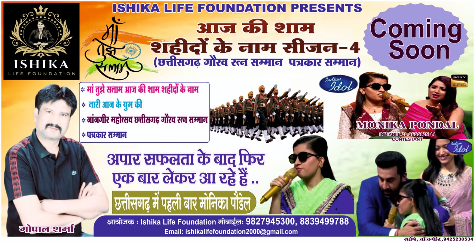 कार्यक्रम की सबसे बड़ी खासियत यह होगी कि इंडियन आइडल सीजन-14 की चर्चित कंटेस्टेंट मोनिका पॉन्डाल पहली बार छत्तीसगढ़ में अपनी प्रस्तुति देने आ रही हैं। उनके soulful और जोशीले गीत श्रोताओं को शहीदों की याद में सराबोर कर देंगे। इंडियन आइडल के मंच पर अपनी खास पहचान बनाने वाली मोनिका इस बार देशभक्ति गीतों से एक बार फिर दर्शकों का दिल जीतने आ रही हैं।