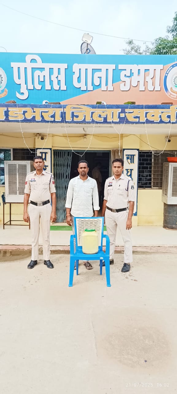 सक्ति : पुलिस अधीक्षक अंकिता शर्मा (भा.पु.से), अतिरिक्त पुलिस अधीक्षक हरीश यादव (रा.पु.से.), एवं अनुविभागीय अधिकारी पुलिस चंद्रपुर डभरा अंजली गुप्ता (रा.पु.से.) हो रहे अवैध जुओं, सट्टा, शराब और नशीले मादक पदार्थों पर रोकथाम के लिए दिये गए कड़े निर्देश के परिपालन में थाना प्रभारी डभरा के द्वारा थाना क्षेत्र में मुखबिर तैनात किया गया था। दिनांक 21.07.2025 को जरिये मुखबीर से सूचना मिला कि ग्राम धूरकोट का जयकिशन टंडन अपने घर के सामने अवैध रूप से कच्ची महुआ शराब बिक्री हेतु रखा है कि मुखबिर के बताए स्थान पर जाकर रेड कार्यवाही करने पर आरोपी जयकिशन टंडन पिता स्व. एकादशी टंडन उम्र 35 साल ग्राम धूरकोट थाना डभरा के कब्जे से 15 लीटर कच्ची महुआ शराब कीमती 1500 रु. को जप्त कर आरोपी के विरूद्ध अपराध क्रमांक 231/2025 धारा 34 (2) आबकारी एक्ट कायम कर दिनांक 21.07. 2025 को गिरफ्तार किया जाकर माननीय न्यायालय रिमाण्ड पर भेजा गया है।