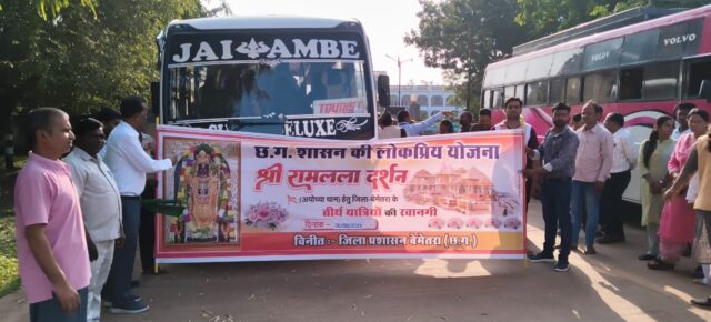 बेमेतरा : छत्तीसगढ़ शासन की महत्वाकांक्षी श्री रामलला दर्शन योजना (अयोध्या धाम) के अंतर्गत जिले से चयनित श्रद्धालुओं का दल आज कलेक्टर श्री रणबीर शर्मा के मार्गदर्शन में अयोध्या धाम के लिए रवाना हुआ। इस योजना के अंतर्गत शासन द्वारा 62 तीर्थयात्रियों (जिसमें 02 अनुरक्षक शामिल हैं) का लक्ष्य निर्धारित किया गया था। इस लक्ष्य के अनुसार जिले के जनपद पंचायत बेमेतरा, साजा, बेरला, नवागढ़ से 48 तीर्थयात्री तथा नगर पालिका परिषद् बेमेतरा एवं नगर पंचायत थानखम्हरिया, नवागढ़, भिमौरी, कुसमी एवं दाढ़ी से 12 तीर्थयात्री चयनित किए गए।प्रातः 07 बजे सभी तीर्थयात्रियों का स्वास्थ्य परीक्षण कलेक्टोरेट भवन के दृष्टि सभाकक्ष में किया गया। इसके बाद 07:30 बजे जिला कलेक्टोरेट परिसर से मुख्य कार्यपालन अधिकारी जिला पंचायत प्रेमलता मंडावी, अपर कलेक्टर श्री अनिल वाजपेयी तथा उप संचालक समाज कल्याण विभाग के द्वारा हरी झंडी दिखाकर श्रद्धालुओं को दो बसों के माध्यम से राजनांदगांव रेलवे स्टेशन के लिए रवाना किया गया। तत्पश्चात श्रद्धालुओं को नगर पालिका अध्यक्ष श्री विजय सिन्हा, जनपद पंचायत बेमेतरा अध्यक्ष श्रीमती हेमा दिवाकर, अपर कलेक्टर, सीईओ जिला पंचायत एवं समाज कल्याण उपसंचालक द्वारा सम्मानपूर्वक विदाई दी गई।
