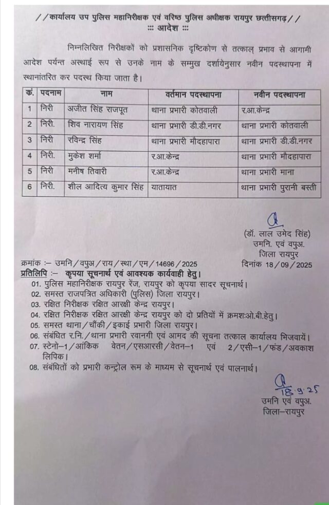 रायपुर : राजधानी के पुलिस महकमे में एक बार फिर बड़ा फेरबदल हुआ है। यहां पुलिस विभाग में कई थाना प्रभारियों को इधर से उधर किया गया है। इस संबंध में एसएसपी रायपुर ने आदेश जारी किया है और कई थाना प्रभारियों को नई जिम्मेदारी सौंपी गई है। जानकारी के मुताबिक, पवन साय की गाड़ी फूटने के बाद कोतवाली टीआई अजीत सिंह राजपूत को लाइन अटैच कर दिया गया है। वहीं, उनकी जगह अब एस.एन. सिंह को कोतवाली का नया थाना प्रभारी बनाया गया है। इसके अलावा रविन्द्र सिंह को को डीडी नगर का नया प्रभारी बनाया गया है। वहीं मौदहापारा में मुकेश शर्मा को जिम्मेदारी दी गई है। इतना ही नहीं मनीष तिवारी को माना थाना का प्रभारी बनाया गया है और शील आदित्य सिंह अब पुरानी बस्ती थाना प्रभारी होंगे।
