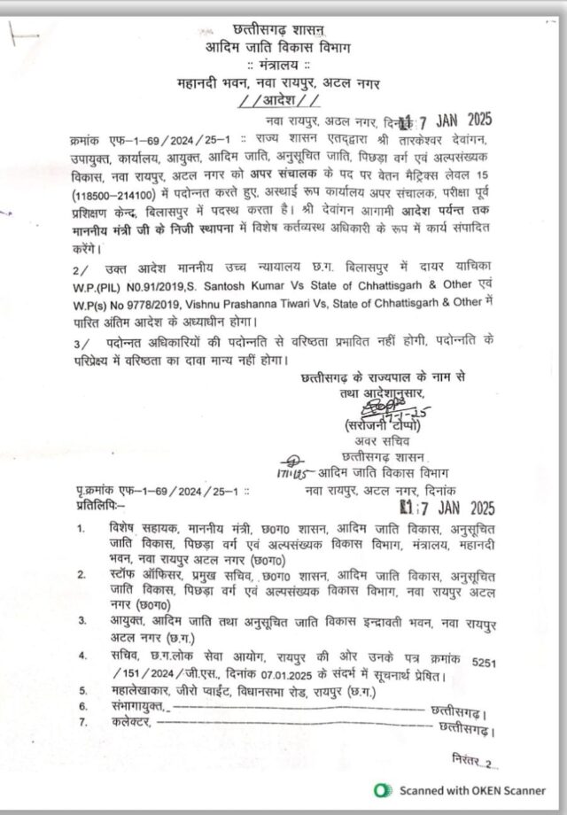वर्तमान में तारकेश्वर देवांगन को बिलासपुर में आदिम जाति तथा अनुसूचित जाति विकास विभाग का अपर संचालक बनाया गया है। सूत्रों का कहना है कि उनकी यह पदस्थापना मंत्री के OSD के साथ उनकी करीबी और गहरी दोस्ती के चलते हुई है। कार्यकर्ता आशीष देव सोनी ने यहां तक आरोप लगाया है कि देवांगन और मंत्री के OSD के बीच मिलीभगत के कारण ही पदोन्नति की फाइल को नियमों की अनदेखी करते हुए हरी झंडी दिखाई गई। अब सवाल यह है कि मंत्री के संज्ञान में आने के बाद देवांगन इस पद पर कितने समय तक बने रहते हैं।