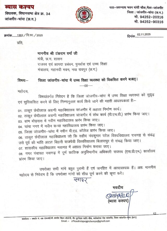 महाविद्यालयीन छात्र-छा़त्राओं एवं स्टाॅफ के द्वारा महाविद्यालय को रायगढ़ के बजाय बिलासपुर विश्वविद्यालय से संबंद्ध करने की मांग की जा रही है। ब्यास कश्यप ने अपने पत्र में चांपा नगर मेें नवीन कन्या महाविद्यालय प्रारंभ करने, ग्राम बोड़सरा में नवीन महाविद्यालय प्रारंभ करने, जांजगीर-चांपा जिला में नवीन बी.एड. काॅलेज प्रारंभ करने, शासकीय महाविद्यालय नवागढ़ में अहाता निर्माण कराने, नगर पंचायत नवागढ़ में पूर्णकालिक एस.डी.एम. कार्यालय प्रारंभ करने हेतु भी अनुरोध किया है। उपरोक्त मांगें पूर्ण हो जाने पर जिले की उच्च शिक्षा की व्यवस्था सुदृढ़ होगी तथा जिले के छात्र-छात्राओं को भी सुविधा होगी। मंत्री टंकराम वर्मा ने पत्र में लिखी सभी मांगों को ध्यानपूर्वक पढ़ा तथा शीघ्र निराकरण करने का आश्वासन दिया है।