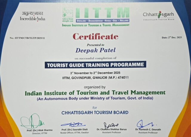 रायपुर, 03 दिसंबर 2025 : पर्यटन विभाग छत्तीसगढ़ के सौजन्य से भारतीय पर्यटन एवं यात्रा प्रबंधन संस्थान आईआईटीटीएम ग्वालियर में 45 युवाओं ने सफलतापूर्वक गाइड प्रशिक्षण का कार्यक्रम पूरा कर लिया है। पर्यटन एवं संस्कृति मंत्री श्री राजेश अग्रवाल ने प्रशिक्षणार्थियों को उनके उज्ज्वल भविष्य के लिए हार्दिक बधाई और शुभकामनाएं दी हैं।