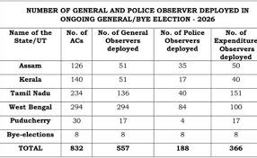 रायपुर, 18 मार्च 2026 : भारत निर्वाचन आयोग (ECI) ने असम, केरल, पुडुचेरी, तमिलनाडु और पश्चिम बंगाल की विधानसभाओं के आगामी आम चुनावों और 6 राज्यों में होने वाले उपचुनावों के लिए 1,111 पर्यवेक्षक तैनात किए हैं।