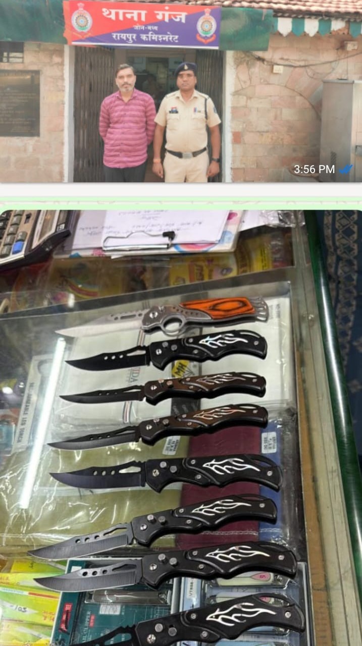 दिनांक 04.04.2026 को मुखबिर से सूचना प्राप्त होने पर पुलिस टीम द्वारा रेलवे स्टेशन रोड स्थित जीपीएस जनरल स्टोर्स में जांच की गई। मौके पर उपस्थित व्यक्ति ने अपना नाम हर्षील जैन पिता मीतलाल जैन, उम्र 42 वर्ष, निवासी रमन मंदिर वार्ड, फाफाडीह, थाना गंज, जिला रायपुर बताया। तलाशी के दौरान दुकान से 08 नग स्टील के धारदार बटनदार चाकू बरामद किए गए।